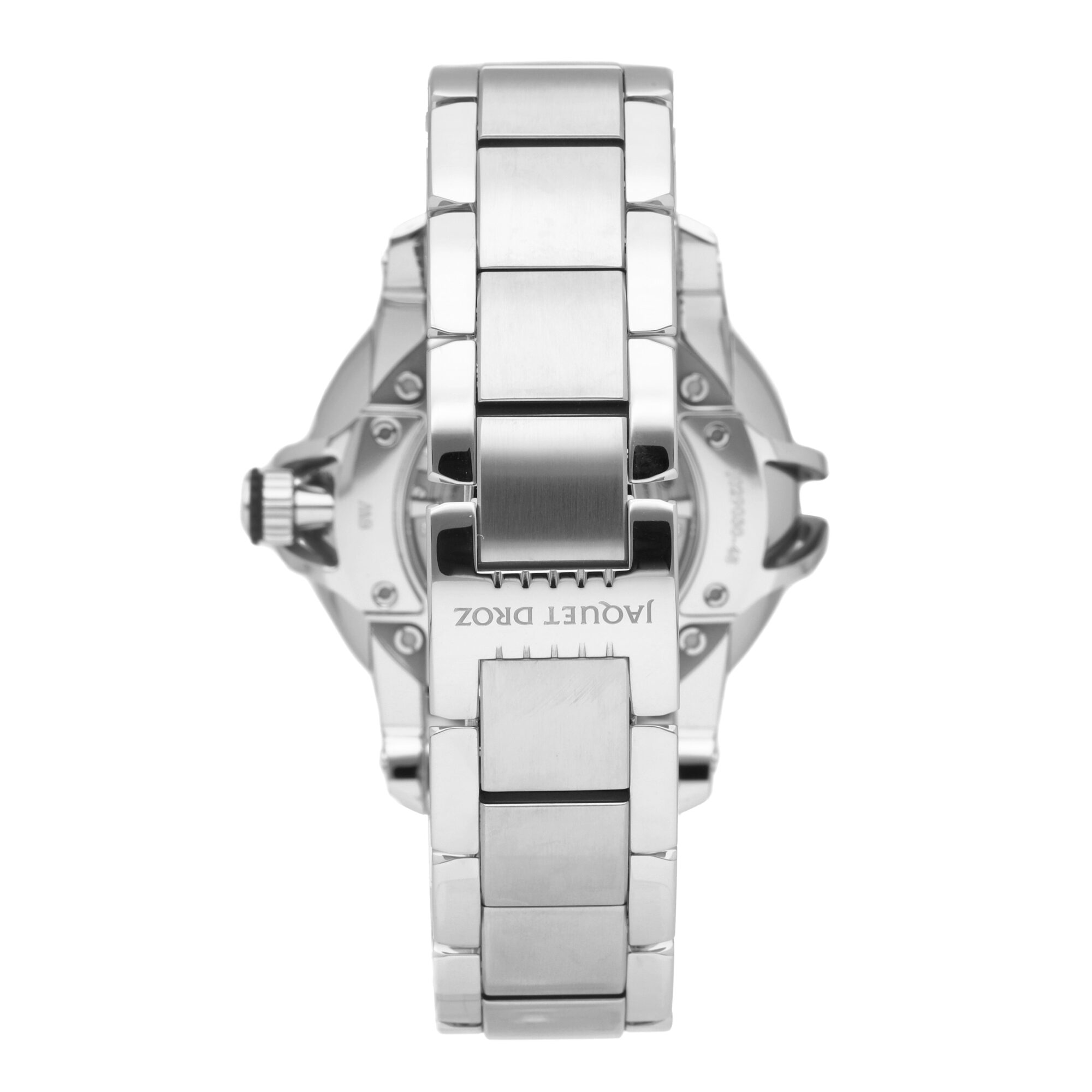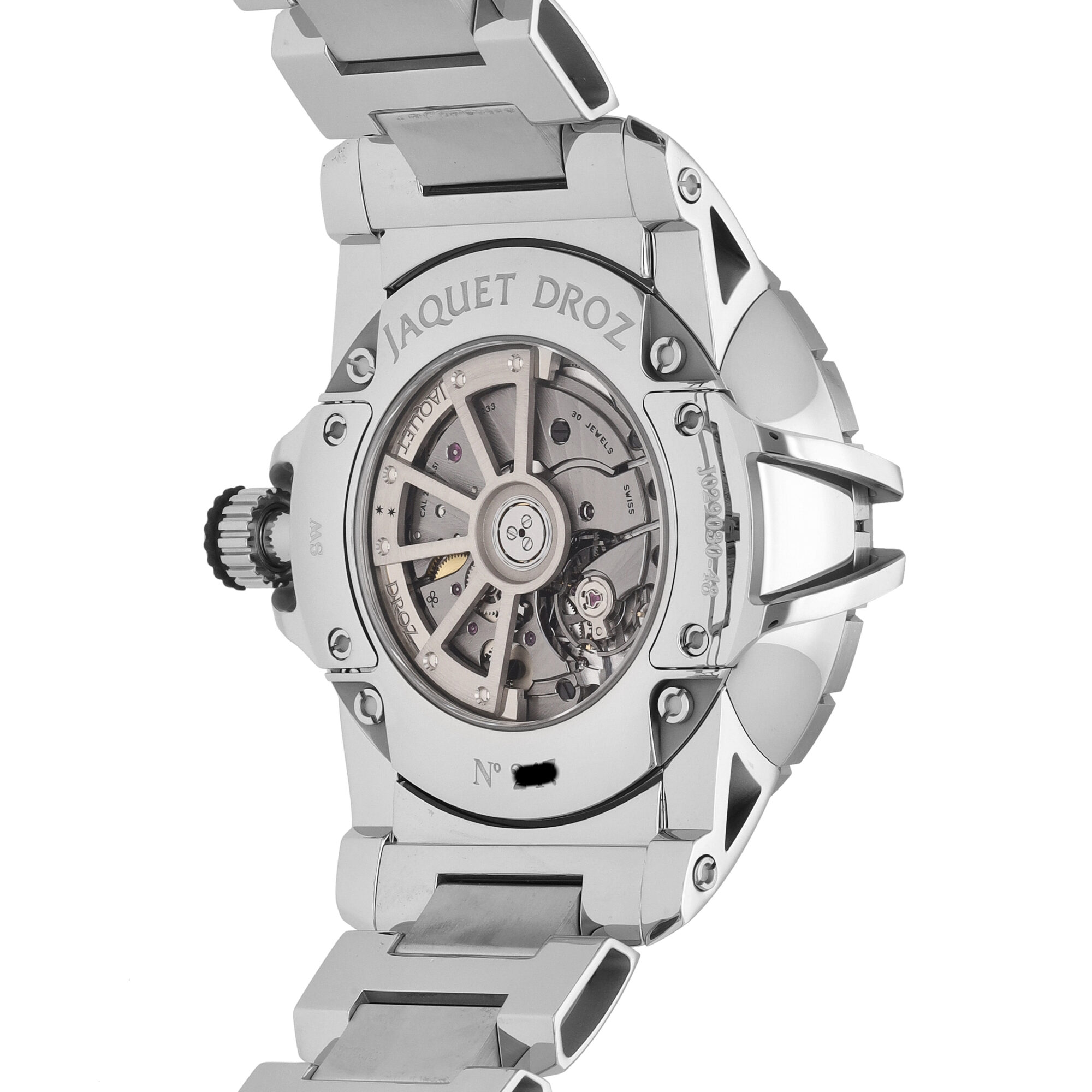 - Jaquet Droz Caliber 2663A.Si-S with ruthenium treatment, silicon balance spring and pallet horns, beats at 28,800 vph, contains 30 Jewels & has an approximate power reserve of 68 hours.