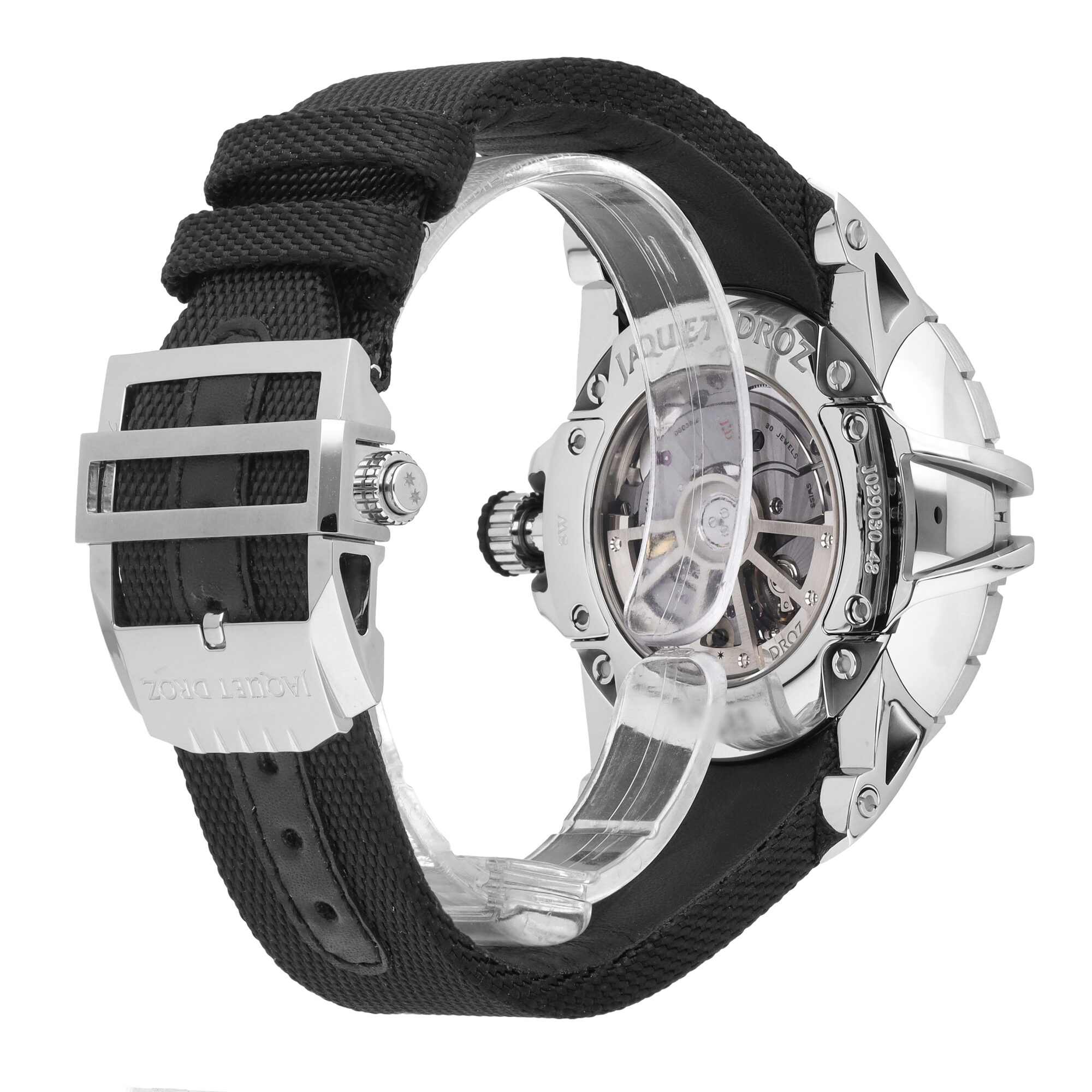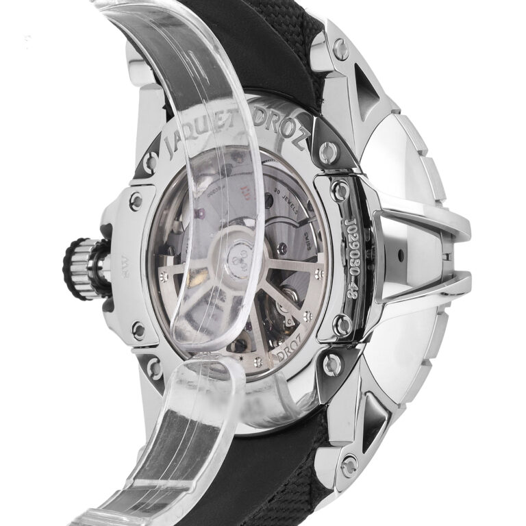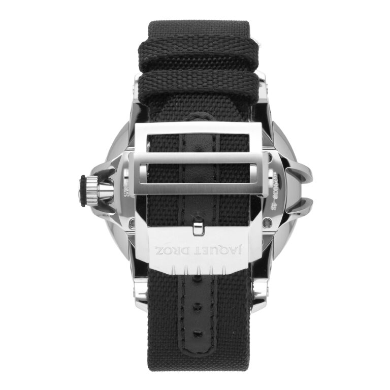 - Jaquet Droz Caliber 2663A.Si-S with ruthenium treatment, silicon balance spring and pallet horns, beats at 28,800 vph, contains 30 Jewels & has an approximate power reserve of 68 hours.