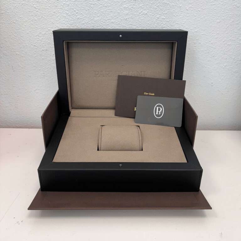 - Completing the watch is a Parmigiani black alligator strap, held by a stainless steel deployant buckle, providing both style and comfort on the wrist.